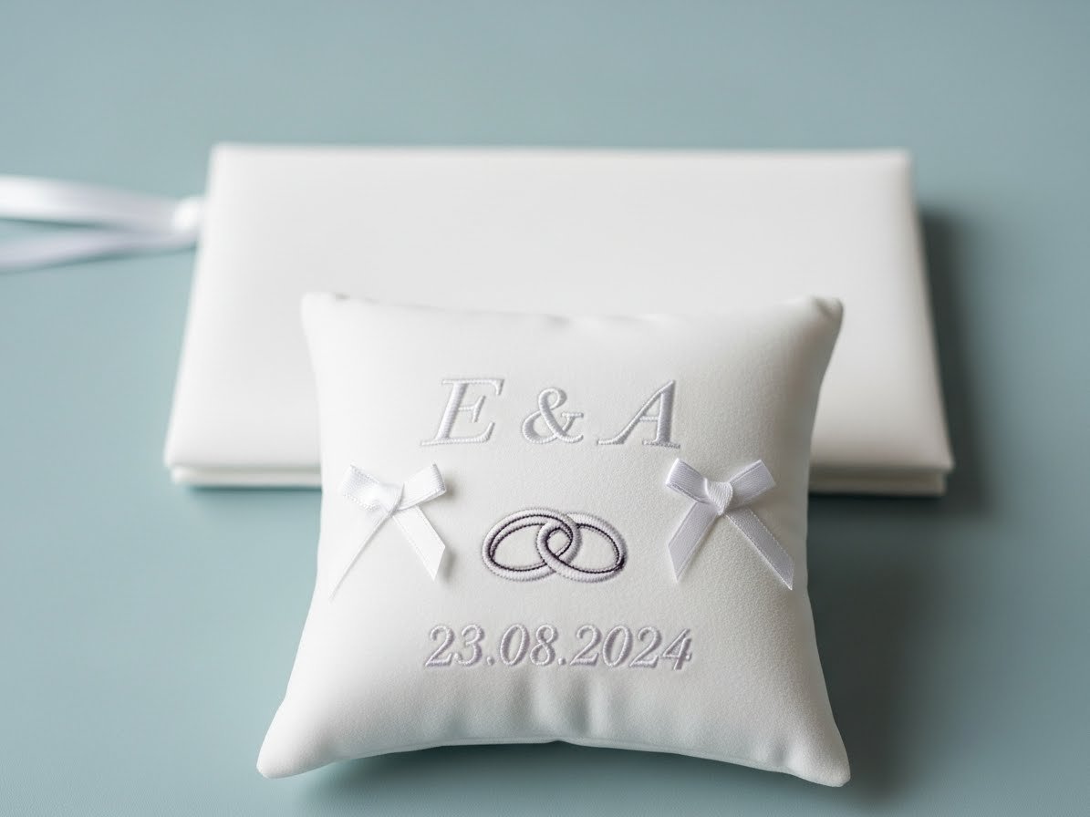 Eine besonders persönliche Note verleiht ihr eurem Ringkissen mit einem Monogramm. Stickt eure Initialen oder das Hochzeitsdatum auf das Kissen. Dies macht das Ringkissen zu einem einzigartigen Erinnerungsstück.